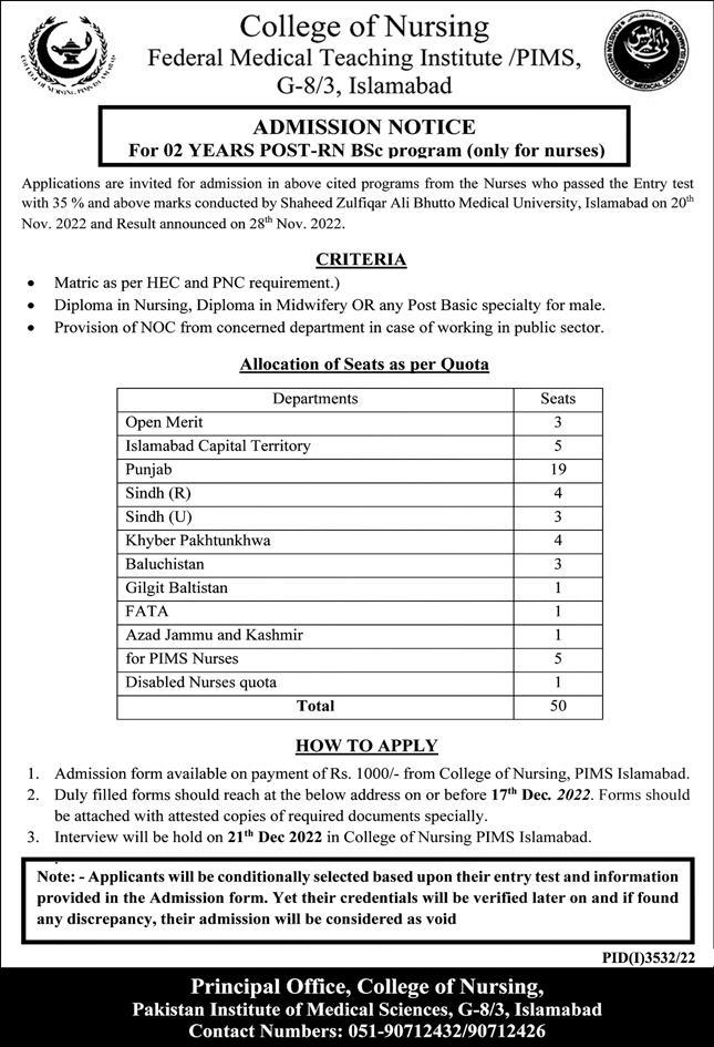 Federal Medical Teaching Institute PIMS is offering admission in the year 2022 for the program of POST RN BSc for Nurses. The criteria for admission is Matric, Diploma in Nursing, Diploma in Midwifery, Or Post Basic Speciality for males, and Provisions of NOC from the concerned department in case of working in the public sector. Candidates who want to apply are advised to not waste any time because the deadline is near December 17, 2022.