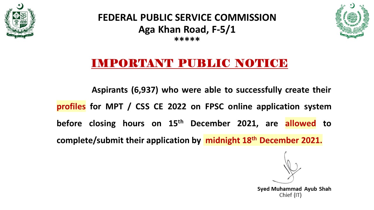 Islamabad, Federal Public Service Commission Islamabad allowed the candidates to send their application forms online for MPT / CSS CE 2022 by 15-12-2021. The candidates, who were completing their online application forms before closing hours on 15-12-2021, they are allowed to complete their application forms and they can send their application forms by midnight of 18-12-2021. The candidates can read that FPSC Extends MPT / CSS CE Online Application 2021 and follow the instructions.