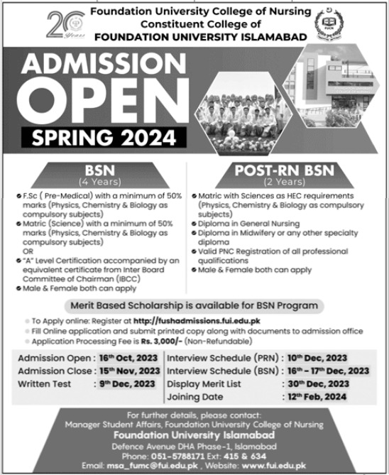 Foundation University College of Nursing is offering diverse range of programs BSN 4 Years: This program is designed for students with a background in F.Sc Pre-Medical or Matric Science. To be eligible, applicants should have a minimum of 50% marks, with Physics, Chemistry, and Biology as compulsory subjects. "A" Level Certification holders accompanied by an equivalent certificate from the Inter Board Committee of Chairman IBCC are also eligible to apply. Male and female candidates are both encouraged to apply.