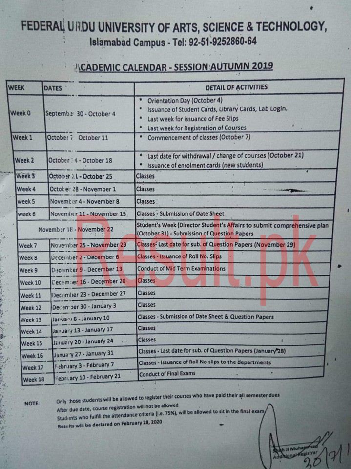 Federal Urdu University Islamabad Declare the Academic calender of session AUTUMN 2019.FUUAST Islamabad Announced the session for the AUTUMN .