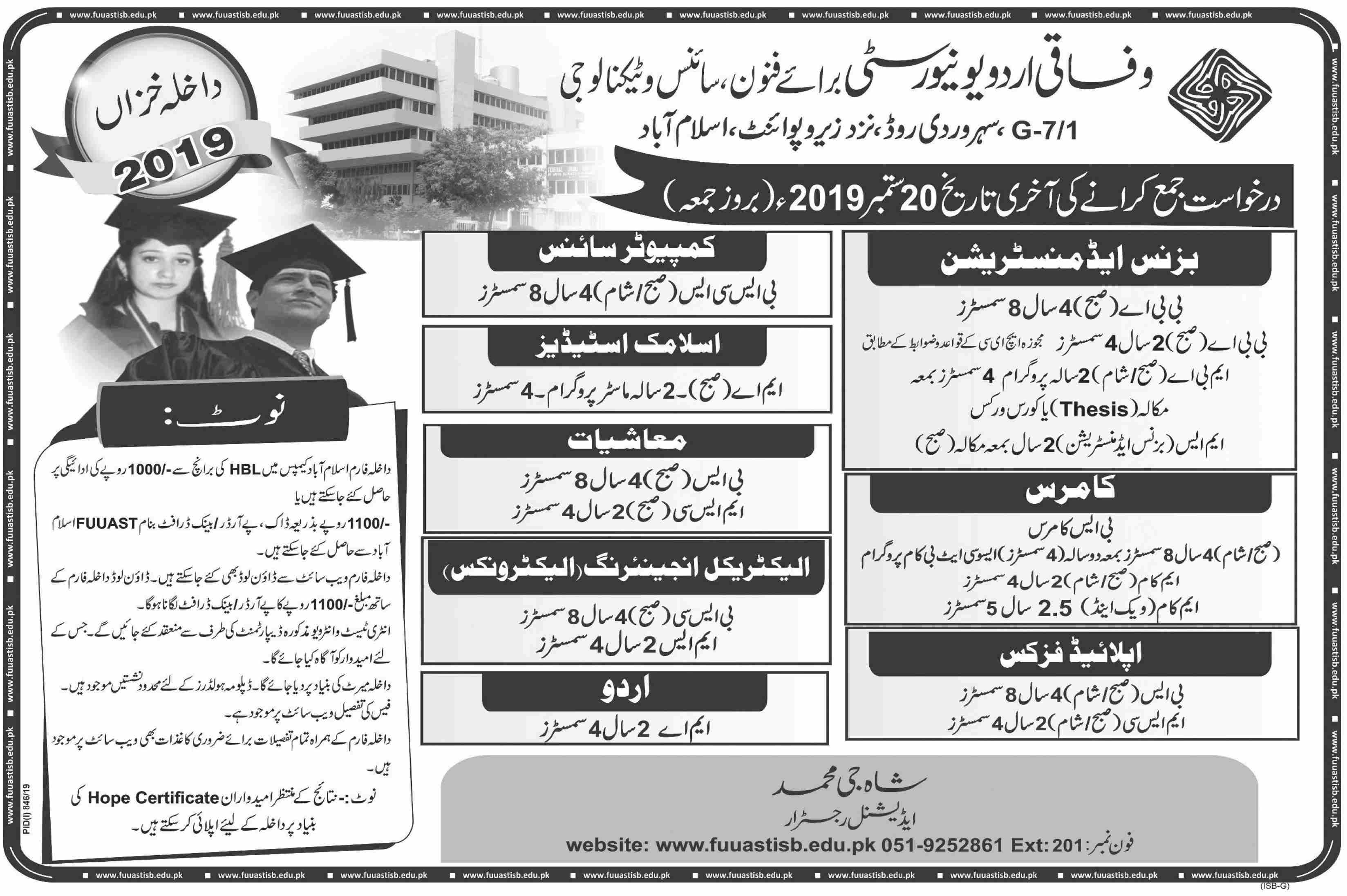 FUUAST, BS BBA BSc BSCS MA admissions 2019