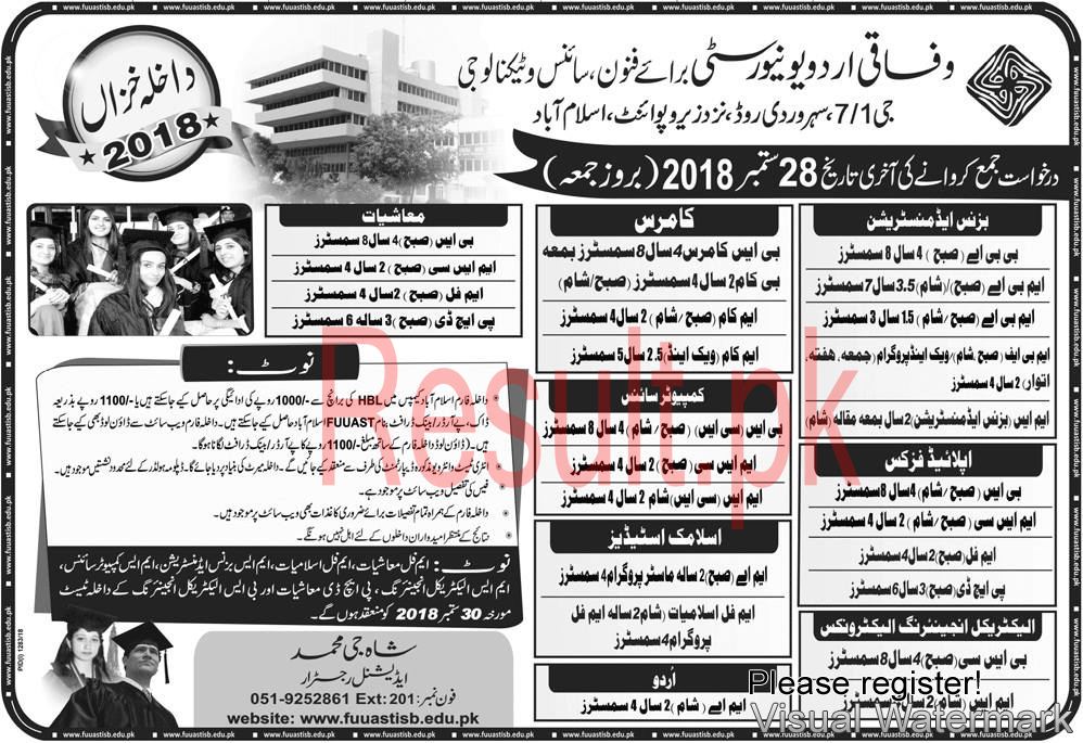 Islamabad, Federal Urdu University of Arts, Science and Technology Islamabad has announced the admission process for the fall semester 2018 in the disciplines including Business Administration, Commerce, Economics, Applied Physics, Computer science, Islamic Studies, Urdu and Electrical Engineering Electronics. The candidates can send their application forms for the admission in the relevant discipline by the last date of 28-9-2018. The candidates can get the application forms on the payment of Rs.1000/- from campus branch of HBL or they can send the draft in the name of the FUUAST Islamabad worth Rs.1100/- to get the admission forms and prospectus. The admission tests of the candidates will be done on 30-9-2018 and the students, who are eligible, they can appear in the admission test and their result will be announced soon. The successful candidates will get admission in the relevant disciplines and they will start their classes.