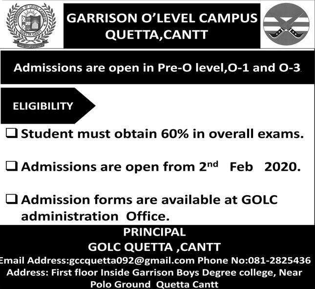 Garrison O'Level Campus Quetta Admission 2020 announced for the class of Pre-O Level, 0-1 and 0-3. The Students can take a part in the Admission of Garrison O'Level Quetta Campus. Admissions are open from 2nd February, 2020.