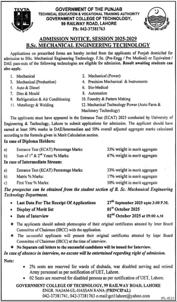 The Government College of Technology Lahore, under the authority of TEVTA, invites applications on prescribed forms from Punjab-domiciled candidates for admission in the B.Sc. Mechanical Engineering Technology 4-year program for the session 2025–2029.