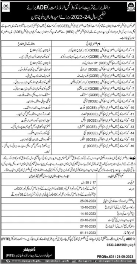 Admissions: Admissions for the ADE program for the year 2023-2024 have been announced by the Government College of Education, Quetta, and other government colleges in Balochistan.