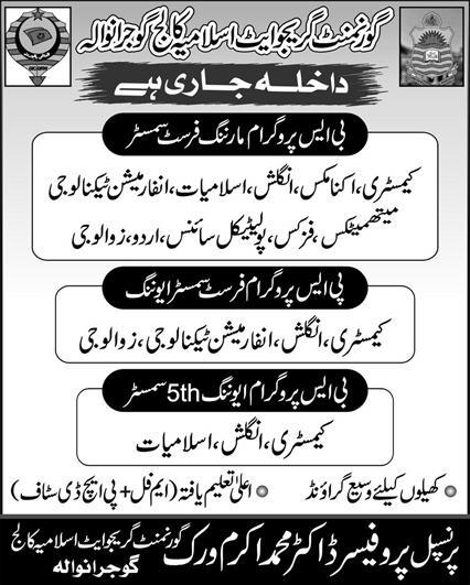 Government Graduate Islam College Gujranwala Admissions 2025 BS Programs