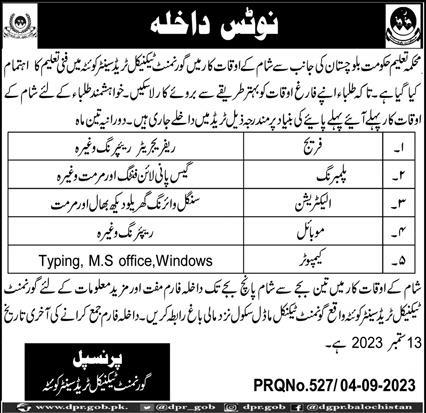 Govt Technical Trade Center GTTC Quetta Admission 2023