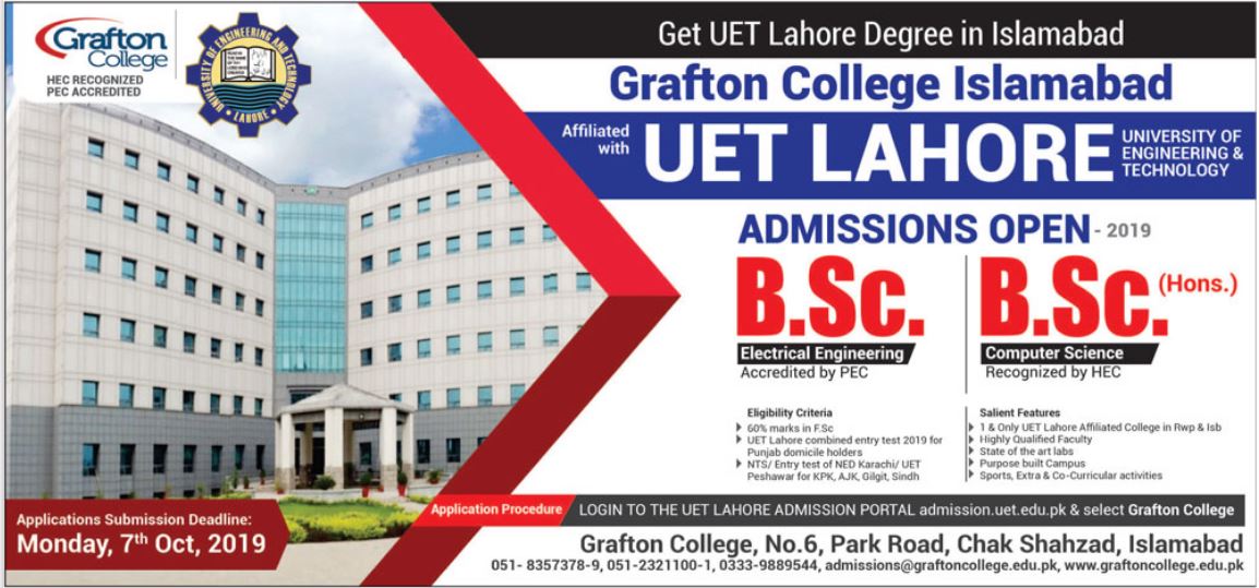Grafton College Islamabad has announced admissions for BSc in Electrical Engineering, Computer science. Last date for submission of admission application 07 Oct 2019.