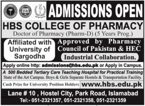 It is to inform all the HBS College of Pharmacy has advertised admission for the year 2022. HBS College of Pharmacy is offering admission in five Years Professional degree program Pharm D. Those Student who want to take admission in Pharm D must visit the appropriate branch or visit Institute official website for further information before the admission date closes. This Institution has well qualified staff and offering the highest level of education.