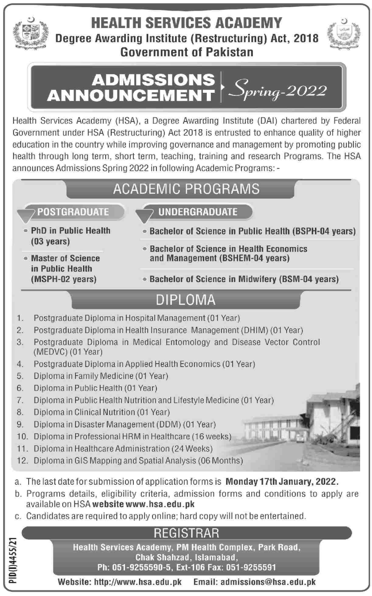 Health Service Academy Islamabad, Degree Awarding Institute DAI Chartered by Federal Government Under HSA is accepting applications from desirous candidates for Admissions to PhD in Public Health 3 Years, Master of Science in Public Health 2 Years, Bachelor of Science in Public Health 4 Years, Health Economics and Management 4 Years, Midwifery 4 Years, Diploma and Certificate Program in Hospital Management, Health Insurance Management, Medical Entomology and disease Vector Control 1 Year, Applied Health Economics, Family Medicine, Public Health, Public Health Nutrition and Lifestyle Medicine, Clinical Nutrition, Professional HRM in Healthcare, GIS Mapping and Spatial Analysis 6 months. The last date for submission of application forms is January 17, 2022. Candidates may apply, Admissions are open for Session 2022.