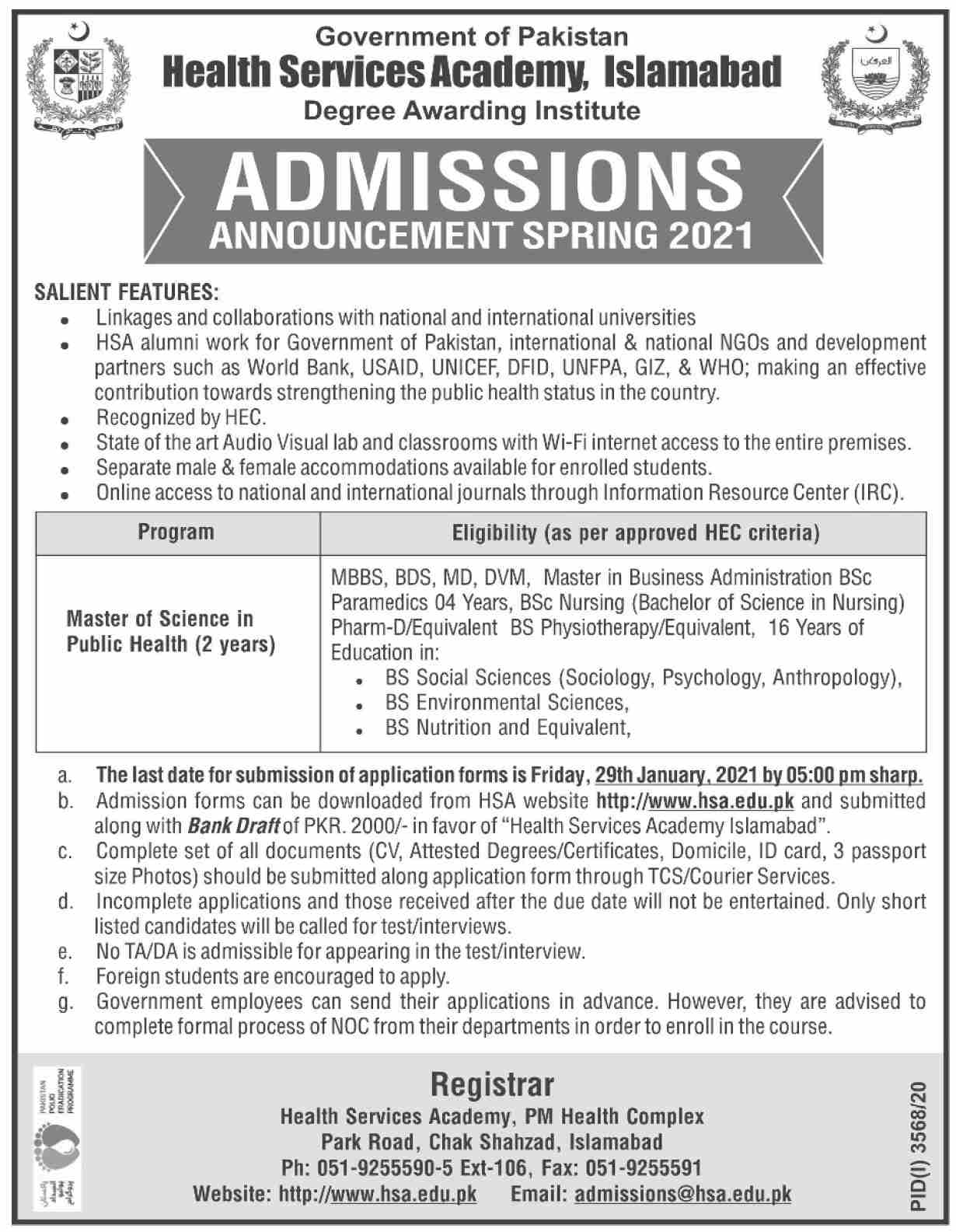 Health Services Academy,Isb Master Of Science in Public Health 2021