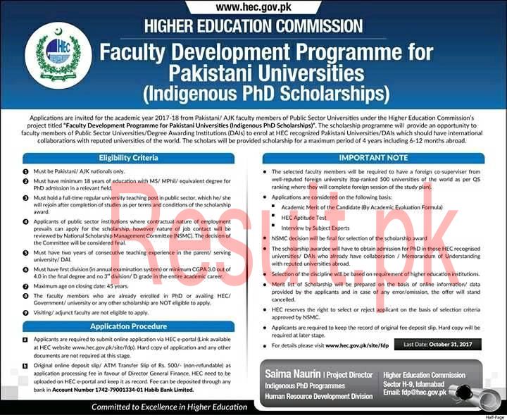 Higher education commission is the responsible for the promotion of higher education in Pakistan and the applications are invited from Pakistani and AJK faculty members for academic year 2017-18 under the project of HEC titled ‘Faculty Development Program for Pakistani Universities (indigenous PhD scholarships). This scholarship will provide the chance to faculty members of public sector universities and the degree awarding institutes so that they can enroll themselves at the HEC. The candidates should read about the eligibility criteria and they should follow them and the candidates should note the last date for sending of the application forms, which is 31st October 2018. The candidates should note the application procedure and the important note and they will get the complete detail from the website of the HEC.
