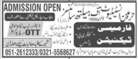 Hermeen Institute of Health Sciences has announced the admissions for Diploma in Pharmacy Technician, Dispenser, Lab Technology, OOT and Radiographer in Islamabad.