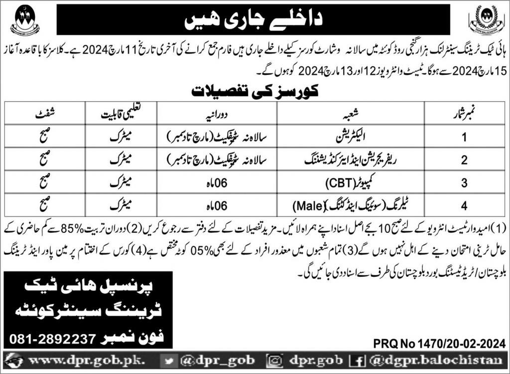 In a world propelled by technology and innovation, acquiring practical skills is indispensable for personal and professional growth. Recognizing this, Hi-Tech Training Center, located on Link Hazar Ganji Road in Quetta, announces ongoing admissions for its annual short courses. Aspiring individuals seeking to enhance their skill set and broaden their career prospects are invited to apply. Heres a detailed overview of the admission process, courses offered, and important dates:
