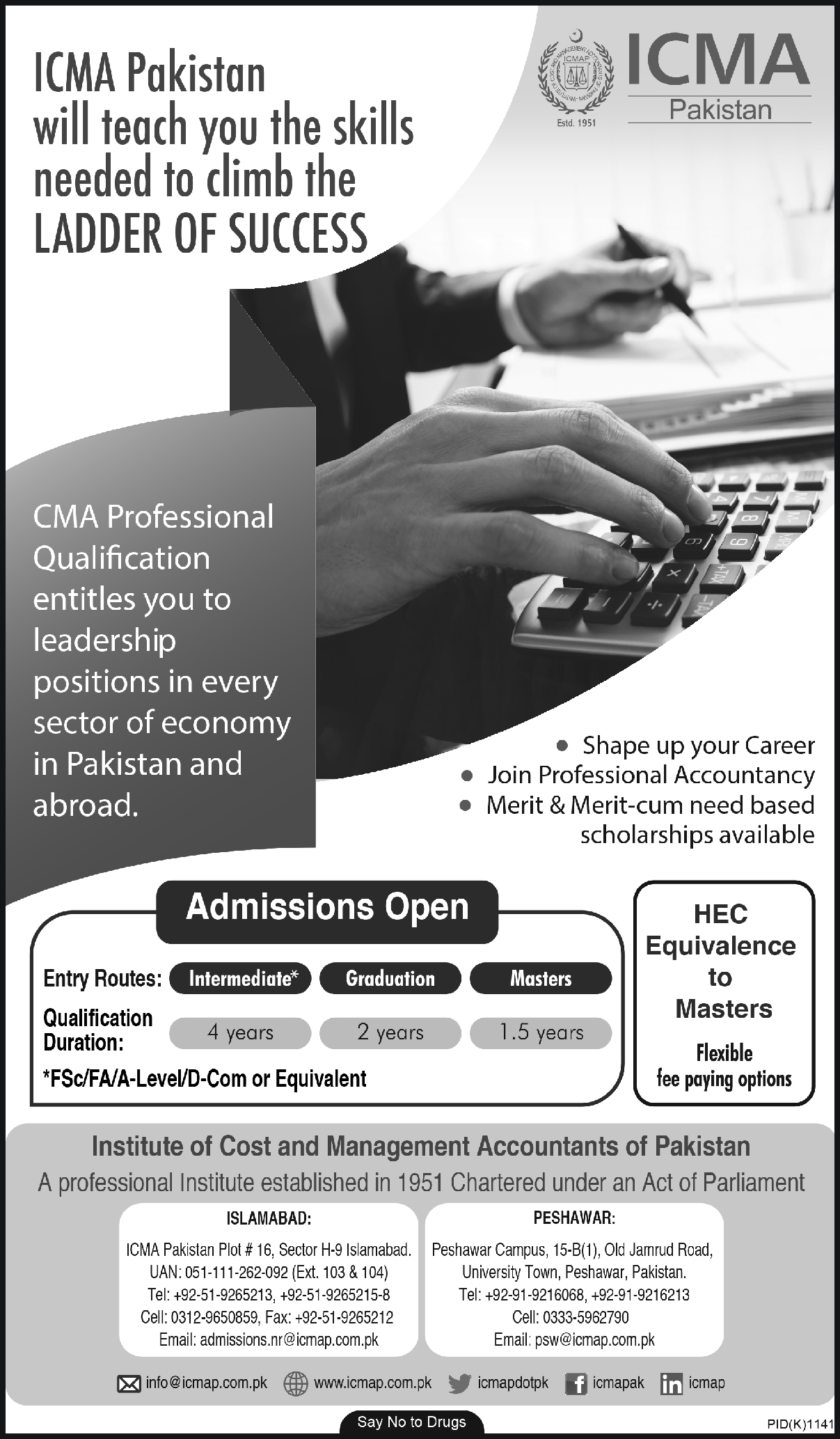 Institute of Cost and Management Accountants of Pakistan Islamabad has offers admissions for CMA Professional qualification Program. Entry routes Intermediate, Graduate,Masters . FSc/FA or Equivalent are eligible to apply.