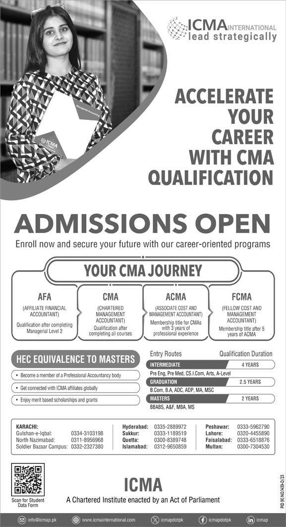 Secure your future by enrolling now at ICMA International. With campuses in major cities like Karachi, Lahore, Islamabad, and others, ICMA International is ready to guide you on your journey to becoming a qualified and successful management accountant.