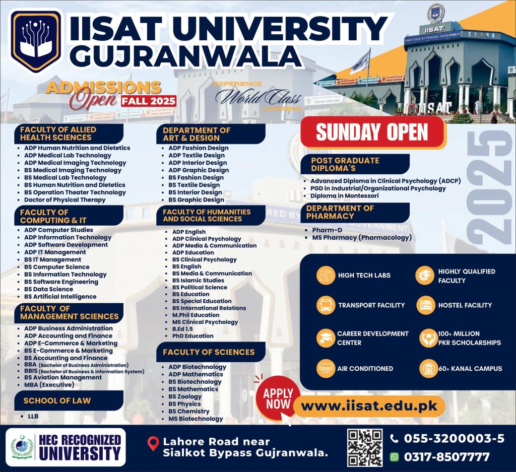 IISAT University, a HEC-recognized and federally chartered institution, proudly announces Admissions 2025 Open for Fall 2025 in a wide range of academic programs. With a campus spread over 60+ kanal, equipped with state-of-the-art labs, highly qualified faculty, and career development support, IISAT offers an education that combines quality, innovation, and opportunity.