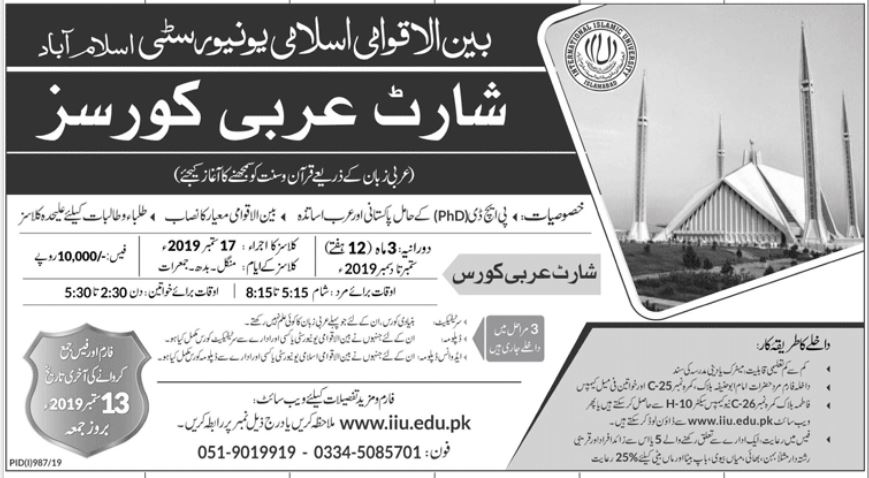 International Islamic University Islamabad has offered admissions for Arabic Language Short Course. Duration of Course 3 months. Fee 10,000RS. Last date for submission of admission application 13 Sep 2019.