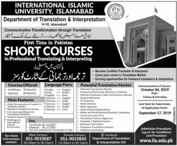 International Islamic University Islamabad has offered admissions for Short Courses in Professional Translating & Interpreting. Language Pairs: Arabic<>English, Urdu<>Arabic, English<>Urdu, Chinese<>Urdu, Chinese<>English, German<>English, German<>Urdu. Last date for submission of admission application 17 Sep 2019.