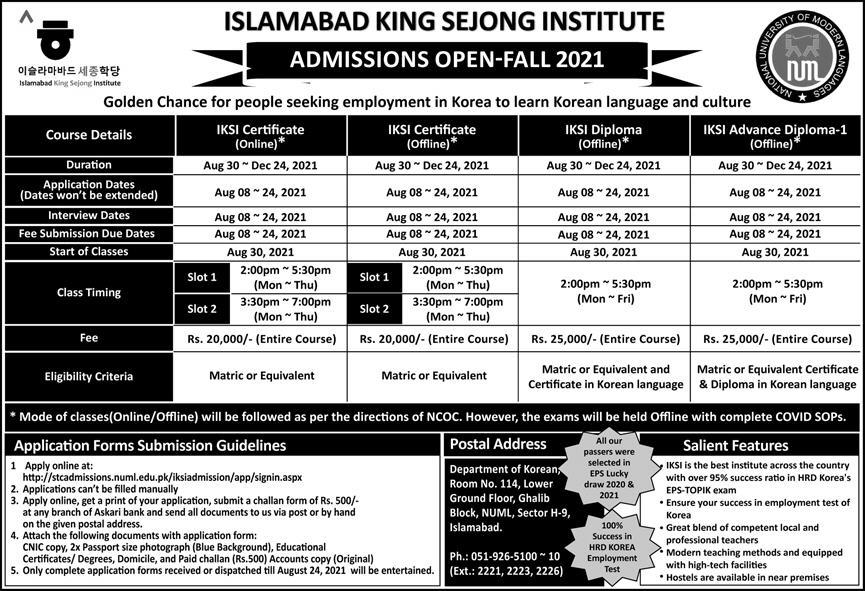 Islamabad King Sejong Institute IKSI is intended to open Admissions and inviting applications to interested candidates for Admissions in Admissions for Course of Korean Language and Culture in IKSI Certificate, EPS TOPIK Preparatory Course, Regular TOPIK Preparatory Course, IKSI Diploma. Candidates having Matric qualification are eligible to apply. Only Complete Applications forms received or dispatched till August 24, 2021 will be entertained. Admissions are open for Fall Session 2021.