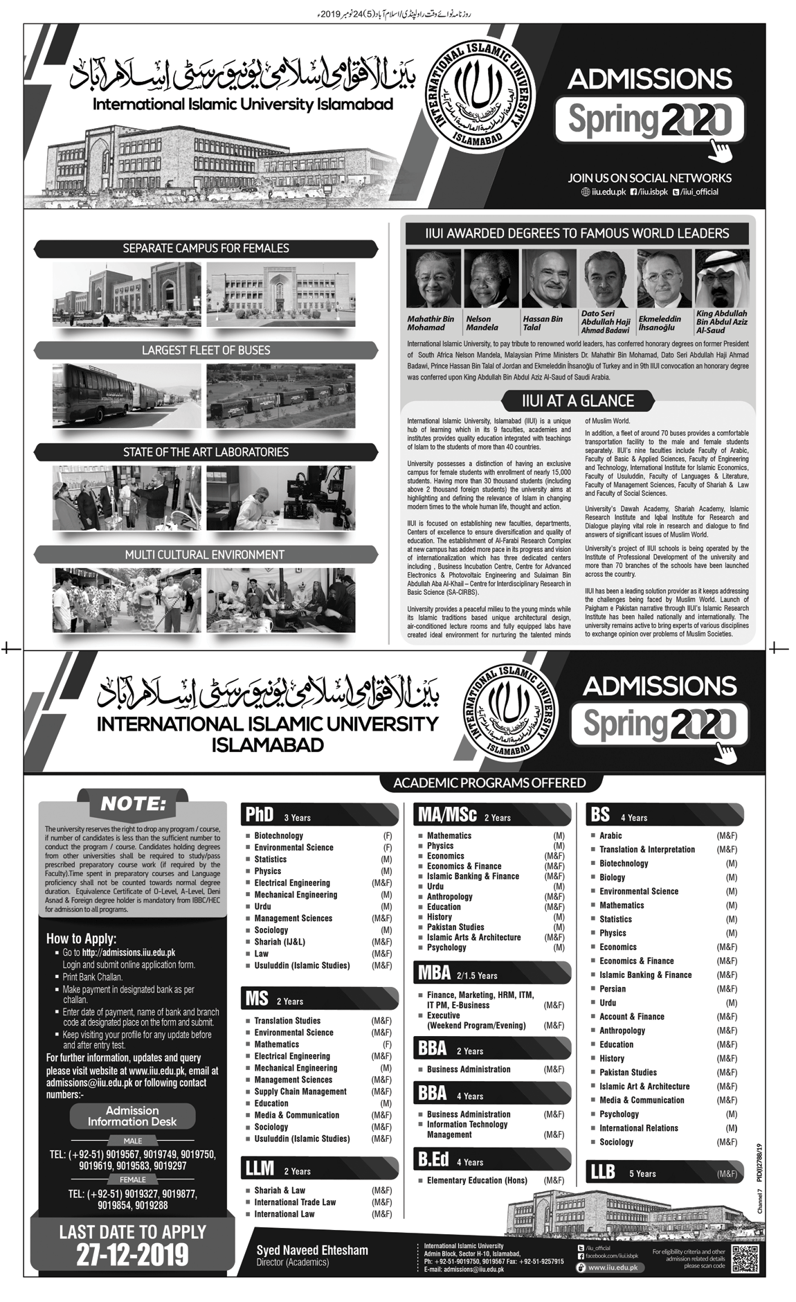 International Islamic University Islamabad has announced admissions for BS in Arabic, Biotechnology, Biology, Mathematics, Statistics, Physics, Persian, Urdu, History, Sociology, BEd, BBA, MA/MSc in Mathematics, Physics, Economics, Urdu, Education, History, Psychology, MBA, LLB. Last date to apply is 27 Dec 2019.