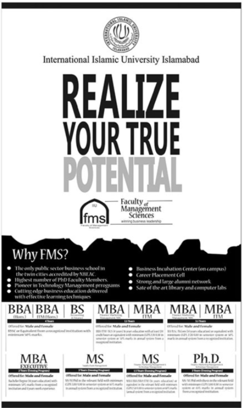 Islamabad, International Islamic University has announced latest advertisement regarding admissions in Faculty of Management Sciences. IIUI Admission program include BBA, BS, MBA, MBA itm, MBA Executive MS and Ph.D. Students who want to get admission in IIUI Management Sciences Program can get complete advertisement here.