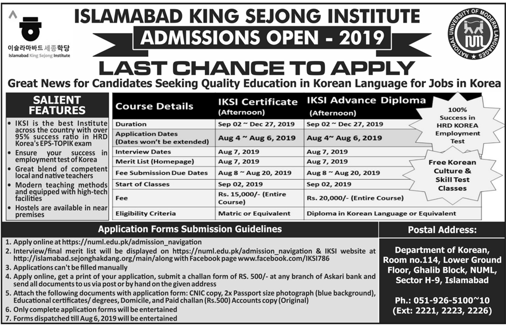 Islamabad King Sejong Institute Korean Lang. admission 2019