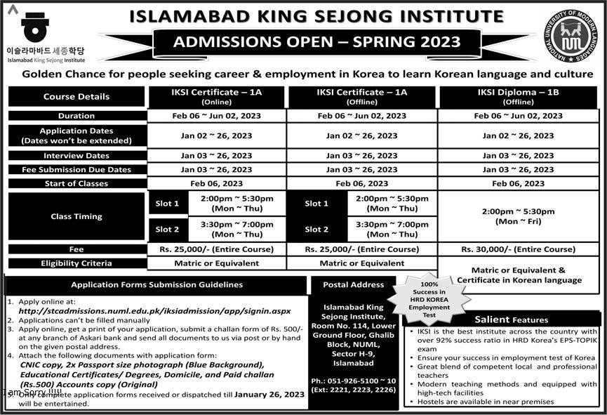 Islamabad King Sejong Institute has advertised admission for Male and Female for the year Spring 2023. Islamabad King Sejong Institute is offering admission in Korean Language Course. Those students who want to take admission in in the Korean Language Course Spring 2023 must visit IKSI official site as soon as possible before the admission date closed. Last date to apply for Korean language course is Jan 26, 2023.