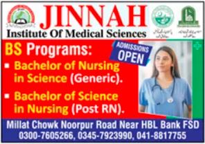 Jinnah Institute of Medical Sciences, located at Millat Chowk, Noorpur Road, Faisalabad, is now accepting applications for admissions 2025 in its prestigious Bachelor of Science in Nursing programs.