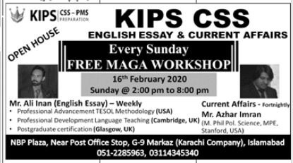 KIPS Admission 2020 announced the Free MAGA Workshop Classes every Sunday for the CSS English Essay & Current Affairs. The Class starts on 16th February, 2020 Sunday at 2:00 pm to 8:00 pm.