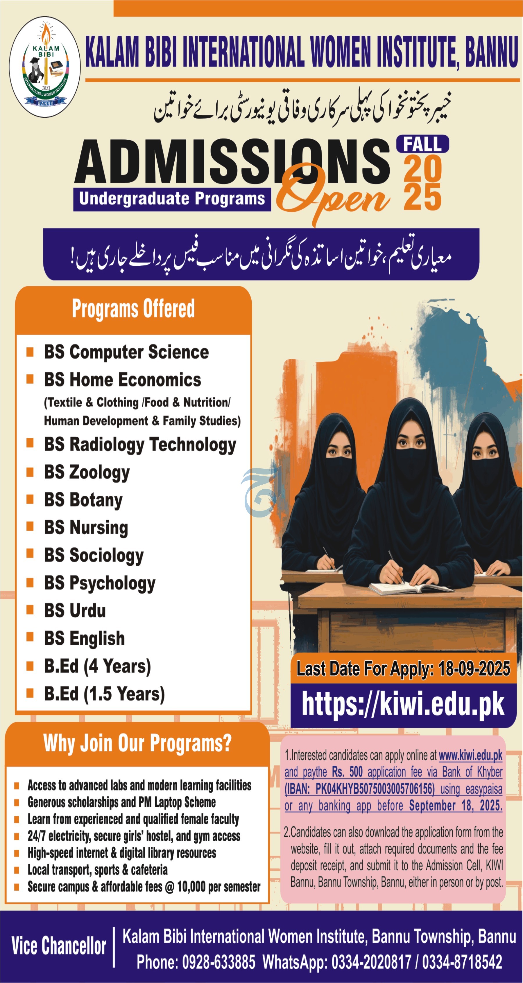 Kalam Bibi International Women Institute KIWI, Bannu — Khyber Pakhtunkhwa’s first public-sector federal university for women — is now accepting applications for Fall 2025 undergraduate admissions.