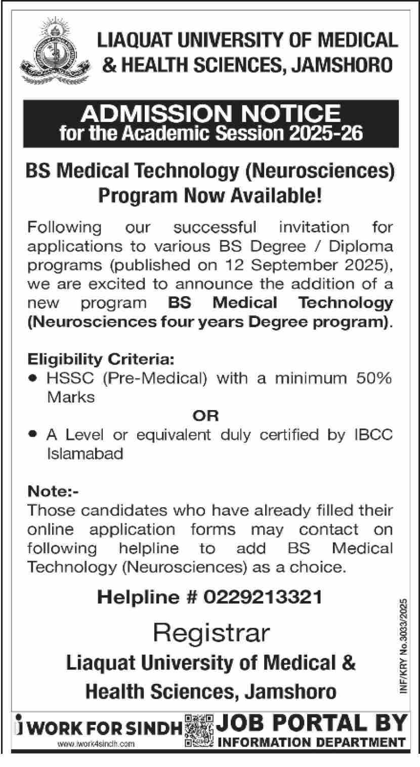 LUMHS is proud to announce the launch of a new four-year undergraduate program in BS Medical Technology Neurosciences, now open for admissions for the academic session 2025–26.