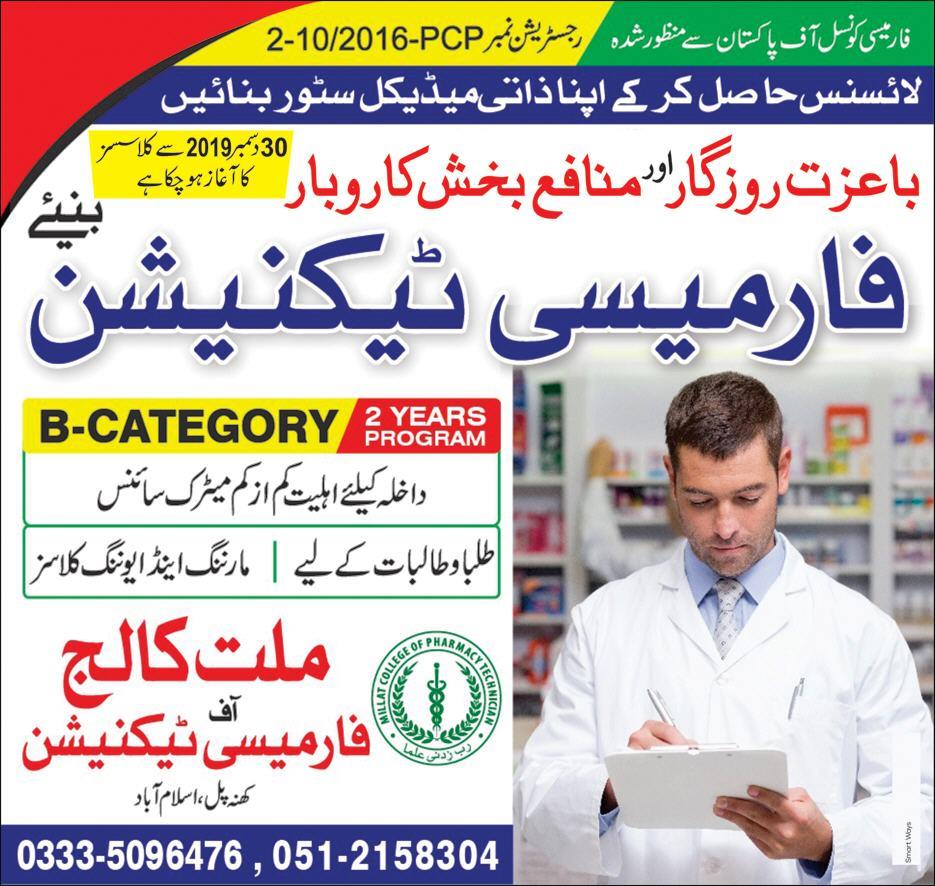 for the session of 2020. The Milat College of Pharmacy Technician Islamabad has now starts the Admission