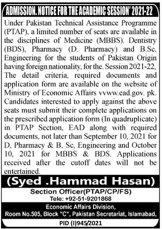 Under Pakistan Technical Assistance Programme PTAP, A limited number of Seats are available in the discipline of Medicine. Applications are being invited to Aspirants for Admissions in MBBS, Dentistry BDS, Pharmacy D. Pharmacy and BSc Engineering for the students of Origin having foreign nationality for the session of 2021-2022. Candidates can check detail of criteria and Form for apply on Ministry of Economic Affairs, Economic Affairs Division website www.ead.gov.pk. Complete Applications should be submitted against the above seats on or before September 10, 2021. Admissions are open.