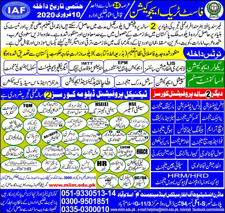 Modern Institute of Information and Management Islamabad announced the Admission for the session of 2020. The Modern Institute of Information and Management Islamabad has now starts the Admission in the Technical Professional Diploma Courses. The Last date of Admission form Submission is 20th Feruary, 2020.
