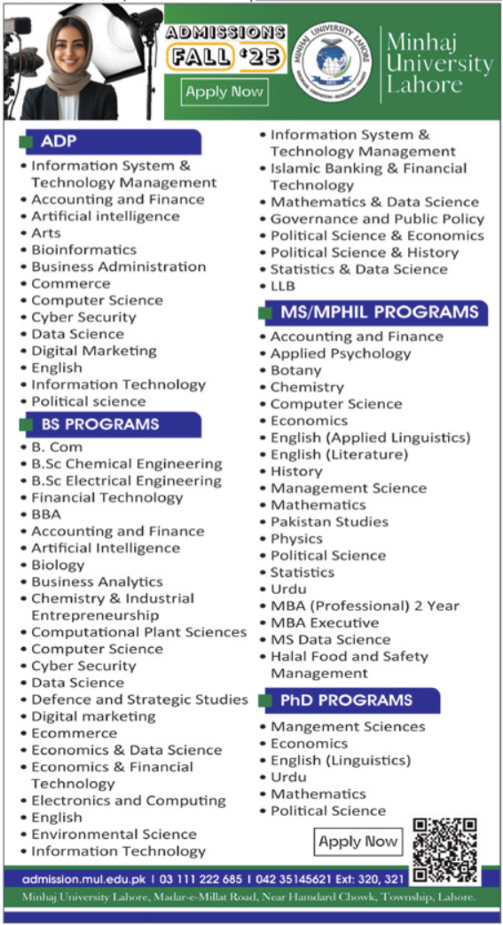 Minhaj University Lahore MUL, a leading institution committed to excellence in education, is now accepting applications for Fall 2025 admissions across a wide range of Associate Degree ADP, Bachelor’s, MS/MPhil, and PhD programs. Whether you are starting your academic journey or planning to pursue advanced studies, MUL offers market-driven programs designed to equip students with skills for the modern world.