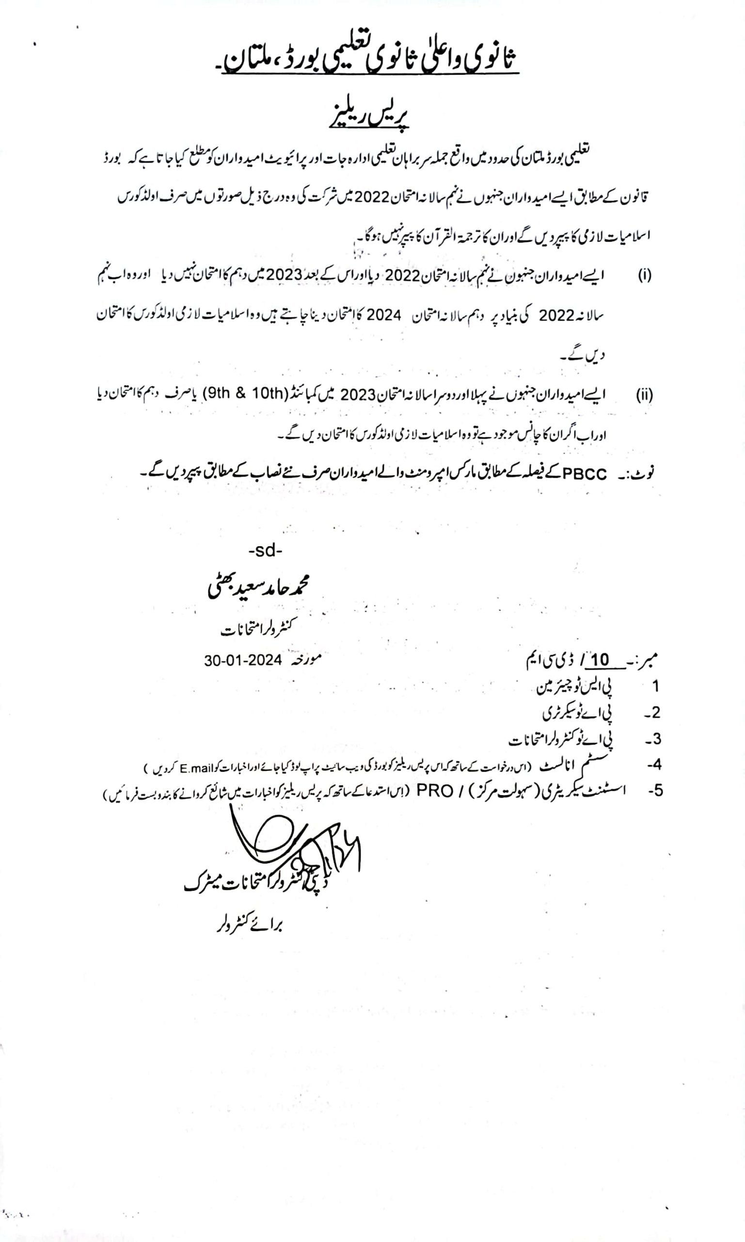 i. Candidates who appeared in the 9th class annual exams in 2022 but did not participate in the 10th class annual exams in 2023 are required to sit for the 10th class annual exams in 2024, following the old course for Islamic Studies.