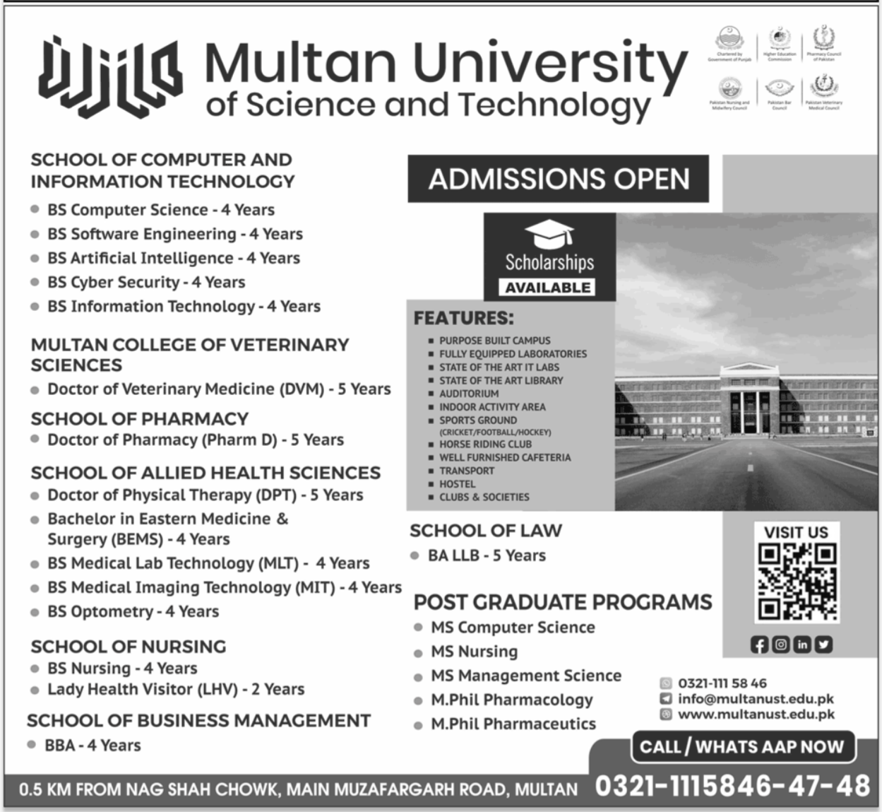 The Multan University of Science and Technology MUST is now accepting applications for the upcoming academic session. Located just 0.5 KM from Nag Shah Chowk on Main Muzaffargarh Road, UJI Multan is a purpose-built campus offering state-of-the-art facilities, experienced faculty, and a diverse range of degree programs across multiple disciplines.