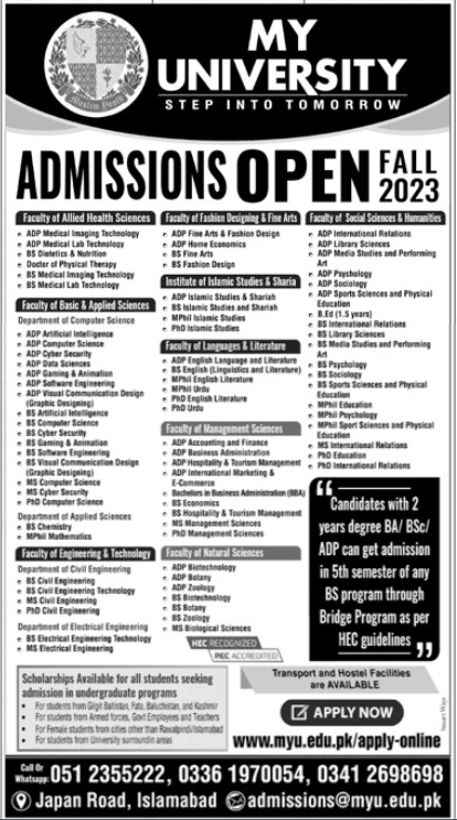 Are you ready to embark on an educational journey that will shape your future and open doors to endless possibilities? MY University, nestled in the heart of Islamabad, invites aspiring students to step into tomorrow by opening its doors for admissions in 2023. With a wide array of programs spanning diverse fields of study, MY University is committed to nurturing the leaders, innovators, and thinkers of the future.MY University offered variety of programs