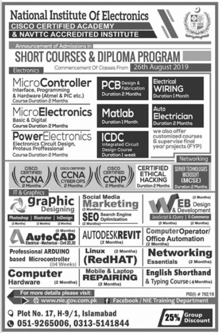 National Institute of Electronics Islamabad has offered admission for DAE courses in Electrical wiring, Power Electronics, Auto Electrician, Graphic Designing, Social Media Marketing, Office Automation, Computer Hardware, English Short Hand typing.