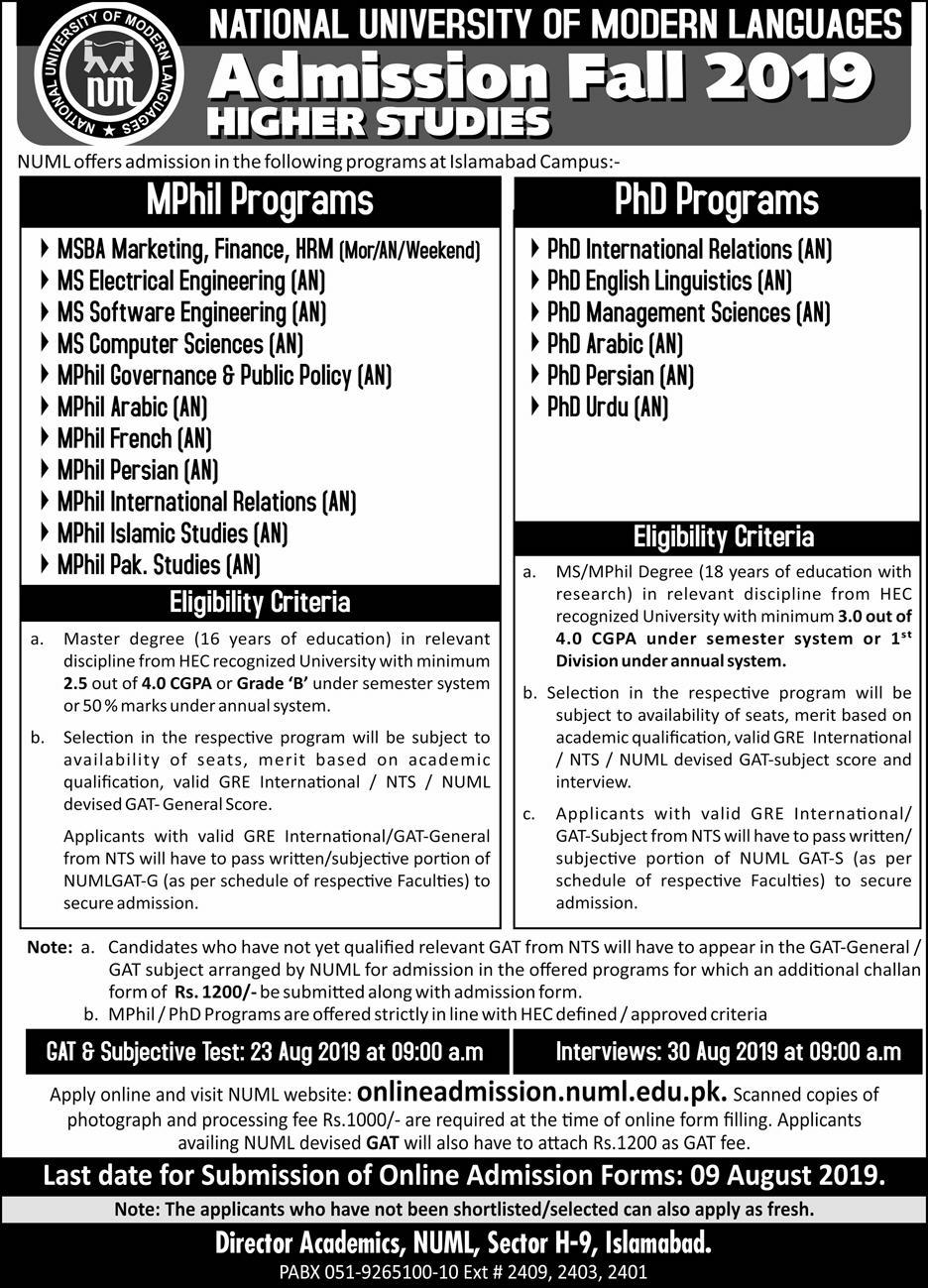 National University of Modern Languages announced Fall 2019 Admission in M.phil & Ph.D