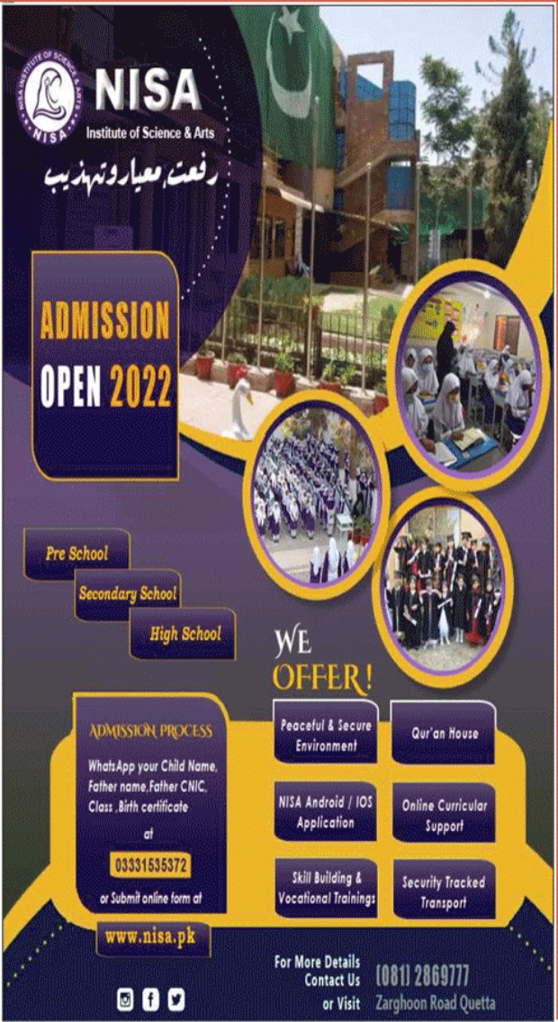NISA Institute of Science & Arts Quetta is inviting applications for enrollment in NISA Admission 2022. NISA Institute Quetta Admissions 2022 are offering in Pre School, Secondary School, High School. NISA Institute of Science & Arts Quetta Admissions are open for Academic Session 2022 in Class Nursery to Intermediate Programs. For taking NISA Quetta Admissions 2022 Parents/Candidates shall send Candidate name, Father name, Father CNIC, Class and Birth Certificate on Whats app number as given on Advertisement or submit online form at NISA official website. NISA Institute Admissions 2022 are processing.