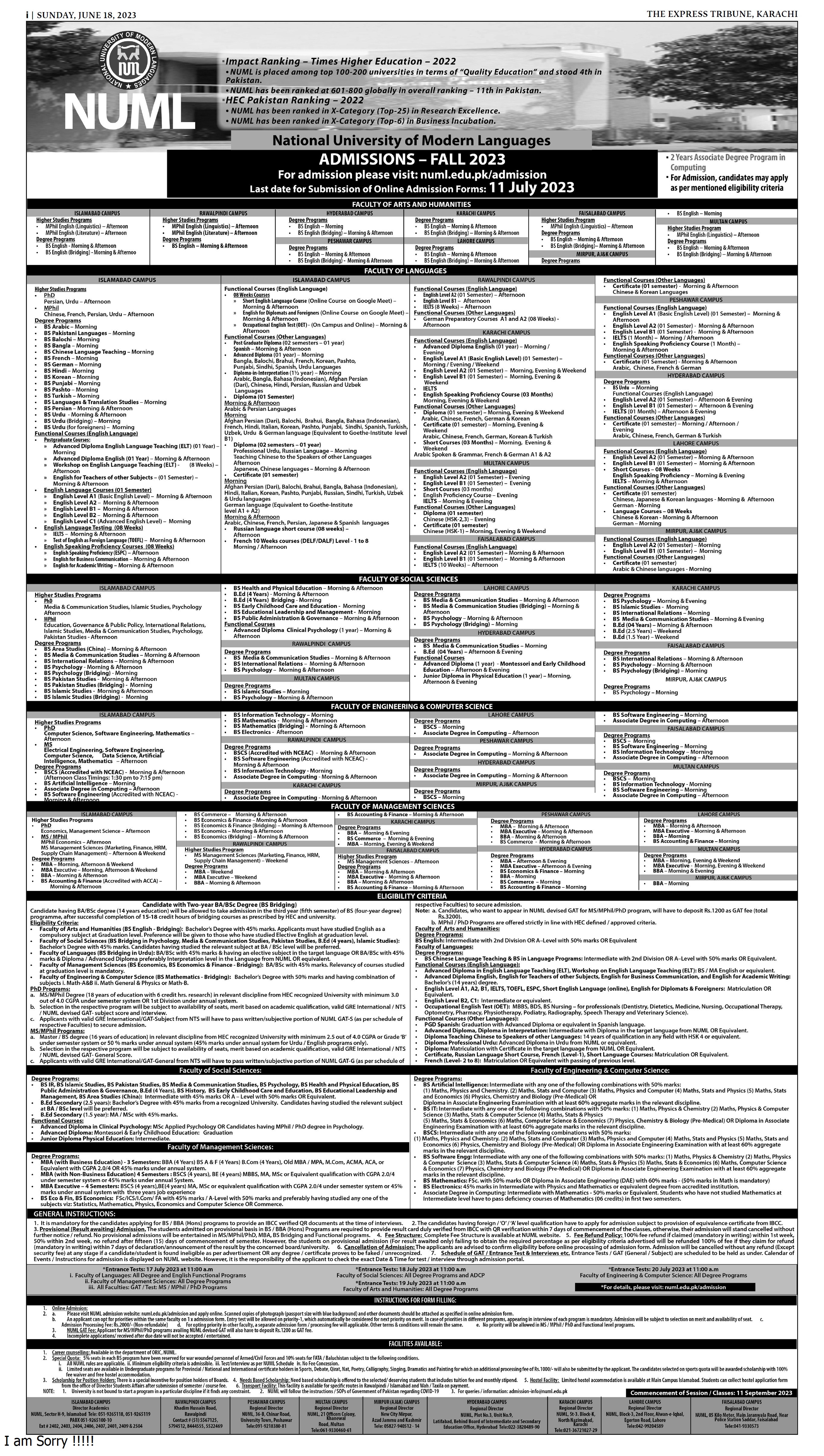 Successful applicants can look forward to commencing their classes on 11th September 2023. The NUML provides a conducive learning environment and opportunities for personal and academic growth. Prospective students are encouraged to seize this chance to join NUML and embark on a rewarding educational journey.