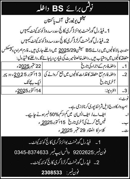 The National University of Pakistan NUP is pleased to announce that admissions 2025 for the BS Four-Year Programs Session 2025–2029 are now open at the following affiliated campuses in Quetta Cantonment: