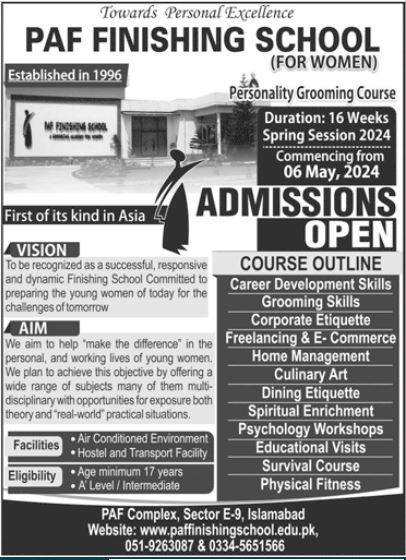 Located in the heart of Islamabad at the PAF Complex, Sector E-9, the school provides an enriching educational experience supplemented by educational visits and physical fitness activities. For more information and admissions, visit www.paffinishingschool.edu.pk or contact 051-9263087 & 0334-5651566. Admissions are open, seize the opportunity to shape your future with PAF Finishing School Admission 2024.
