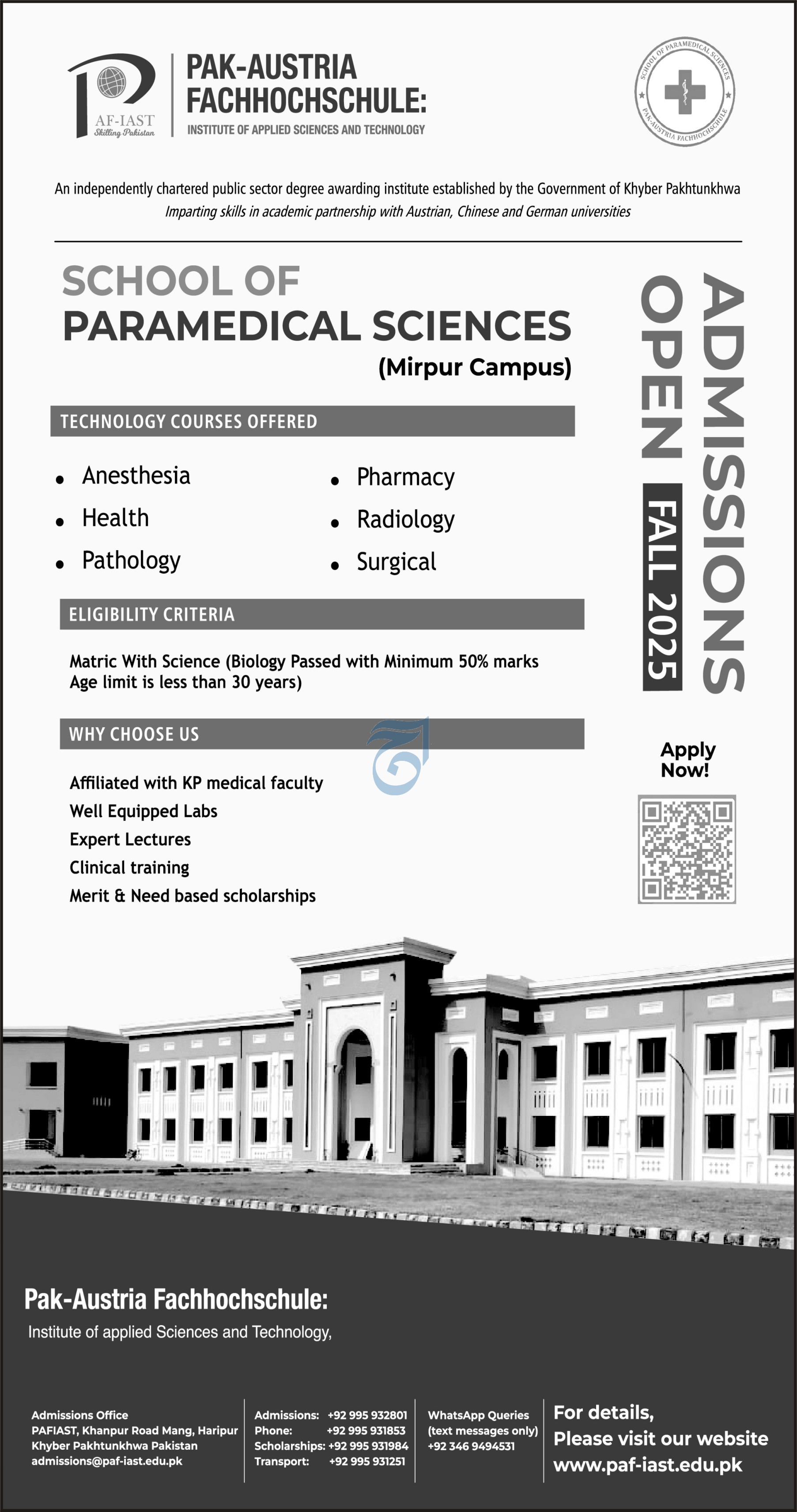 The Pak-Austria Fachhochschule: Institute of Applied Sciences and Technology PAF-IAST is now accepting applications for Fall 2025 in the School of Paramedical Sciences at its Mirpur Campus. As an independently chartered public sector degree-awarding institute established by the Government of Khyber Pakhtunkhwa, PAF-IAST is committed to delivering hands-on, skill-based education in collaboration with international academic partners.