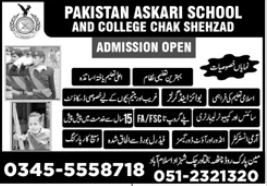 Pakistan Askari School and College, Chak Shehzad, invites you to become a part of our learning community. With a commitment to excellence in both education and character building, we are dedicated to preparing our students for success in all areas of life. Join us and take the first step towards a brighter future.