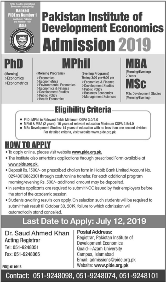 Pakistan Institute of Development Economics Admission 2019