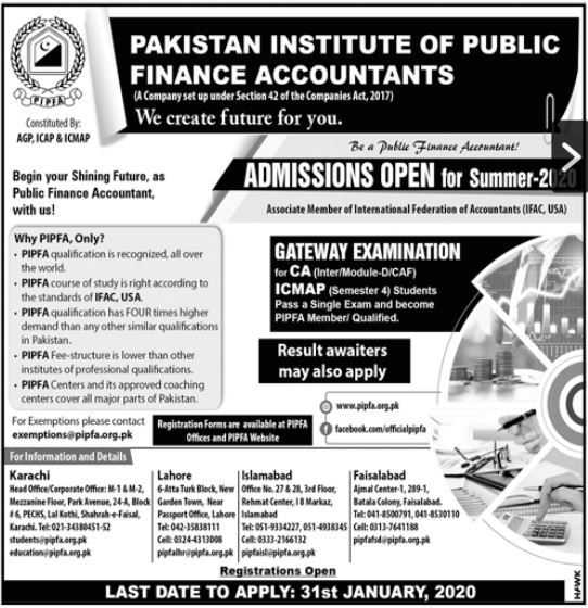 Pakistan Institute of Public Finance Accountants Islamabad has announced admissions for Gateway Examination for CA, ICMA. Result awaiters may also apply. Registration Forms are available at PIPFA Officers and PIPFA Website.