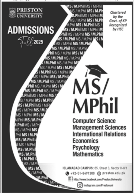 Preston University, a pioneer in higher education in Pakistan, invites applications for MS/MPhil programs for the Fall 2025 intake. Designed for ambitious and career-driven individuals, these programs combine academic rigor with real-world relevance, preparing graduates for leadership roles in academia, industry, government, and beyond.